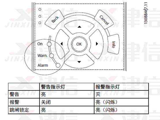 當(dāng)?shù)し鹚棺冾l器出現(xiàn)故障時(shí),警告和報(bào)警通過(guò)以下兩種方式顯示: