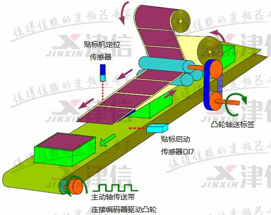 凸輪軸接收來(lái)自主軸的脈沖信號(hào),依主軸節(jié)奏進(jìn)行貼標(biāo)動(dòng)作,傳送標(biāo)簽時(shí)需很準(zhǔn)確平穩(wěn),在粘貼標(biāo)簽時(shí),必須要能穩(wěn)定控制運(yùn)行速度與主軸同步,否則標(biāo)簽貼起來(lái)會(huì)不平順。